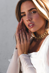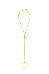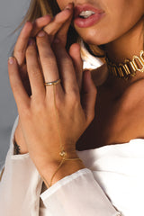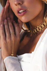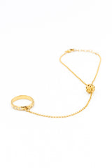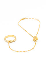 This striking, minimal handpiece is crafted with 24k gold overlay with an ornate charm attaching two delicate chains. The ring features 6 dainty stones made of cubic zirconia. The Stella Handpiece is easy to dress up or dress down – the perfect minimal statement.