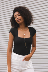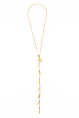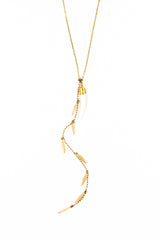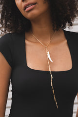 This unique piece is handcrafted in 24k gold overlay and features a natural bone detail. The tousled single-chain has the possibility to style multiple ways for any occasion. The Ivory Necklace has the versatility to wear as a choker or a lengthy drop necklace for any mood.