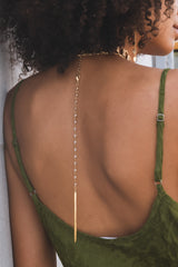 An accessory for your accessories! This unique piece features delicate moonstones and a minimalistic 24k gold overlay bar that acts as an attachment to any necklace in your collection to add a little spice, ideal for any backless dress or top.