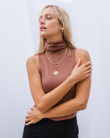 The Valencia coin necklace has been handcrafted with 24k gold overlay and strung with a coin pendant featuring a geometric design reminiscent of ancient coins. The customizable chain lengths allow you to keep it in focus with plunging necklines or layer it with our Cher Necklace