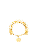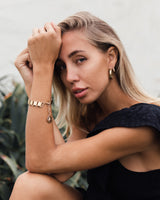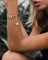 The Madrid Bracelet is made of 24k gold overlay and strung with a contrasting smooth and woven chain. This adjustable bracelet also features a 24k gold coin charm at the end for added interest. This unique piece is a statement on its own but is especially chic paired with our Mesa Coin Necklace.