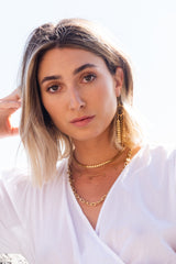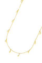 The Izabel Necklace is handmade and strung with sparkly round charms that reflect the light as you move. The chain rests against your collarbone, perfect for layering, and looks particularly elegant paired with our Mi Amor Locket Necklace